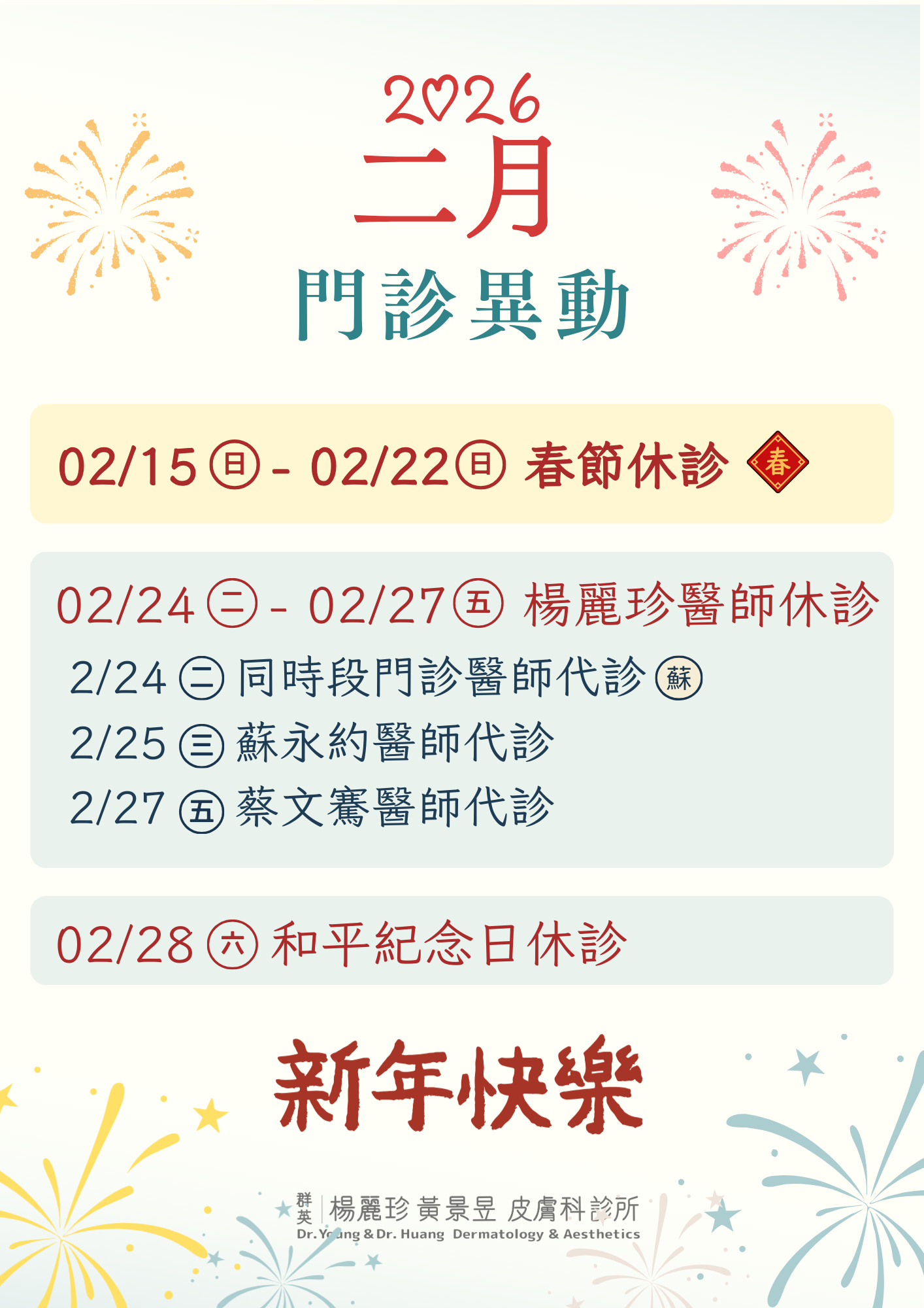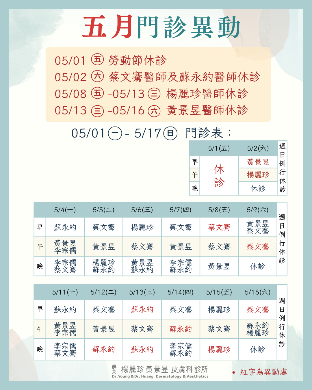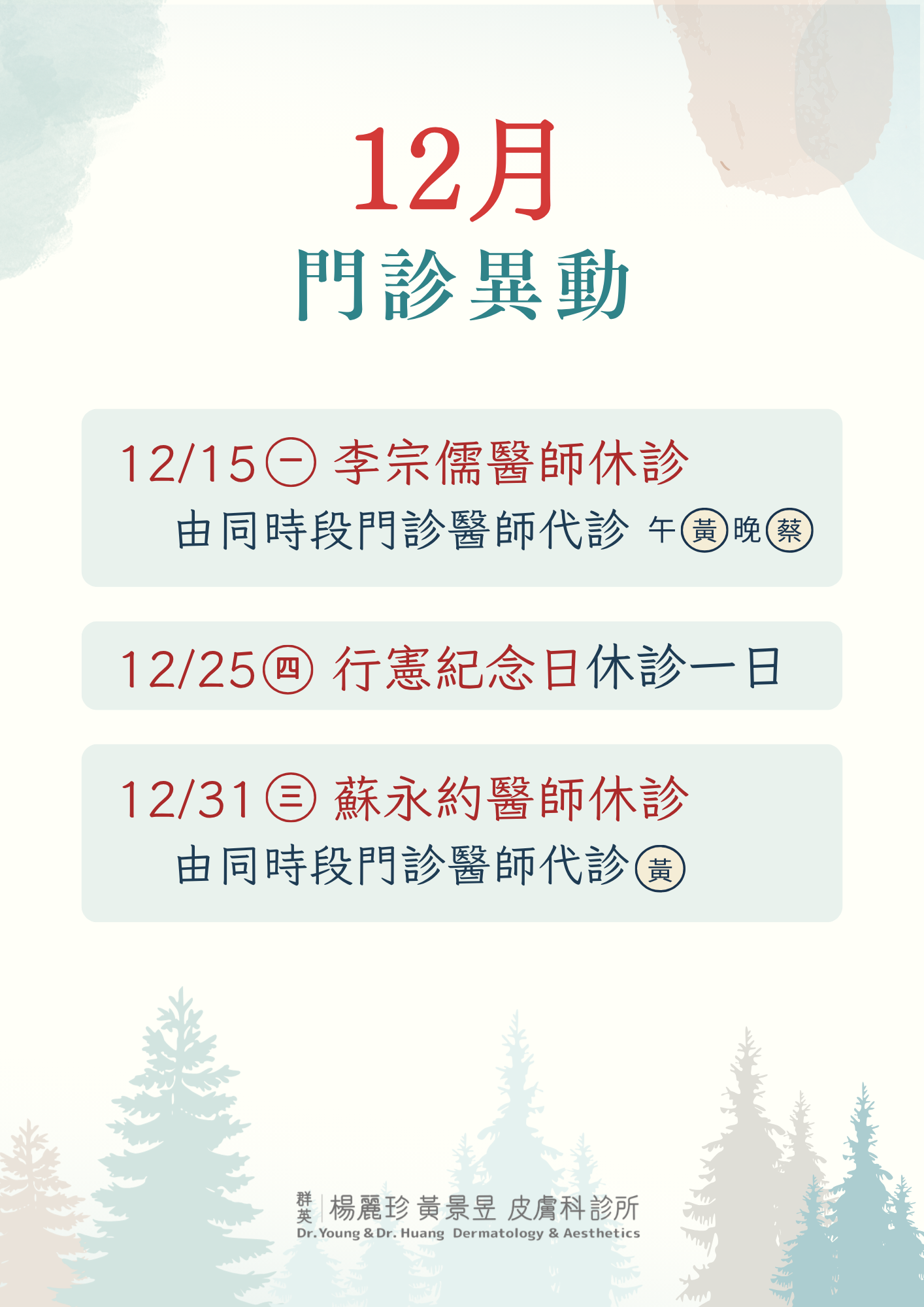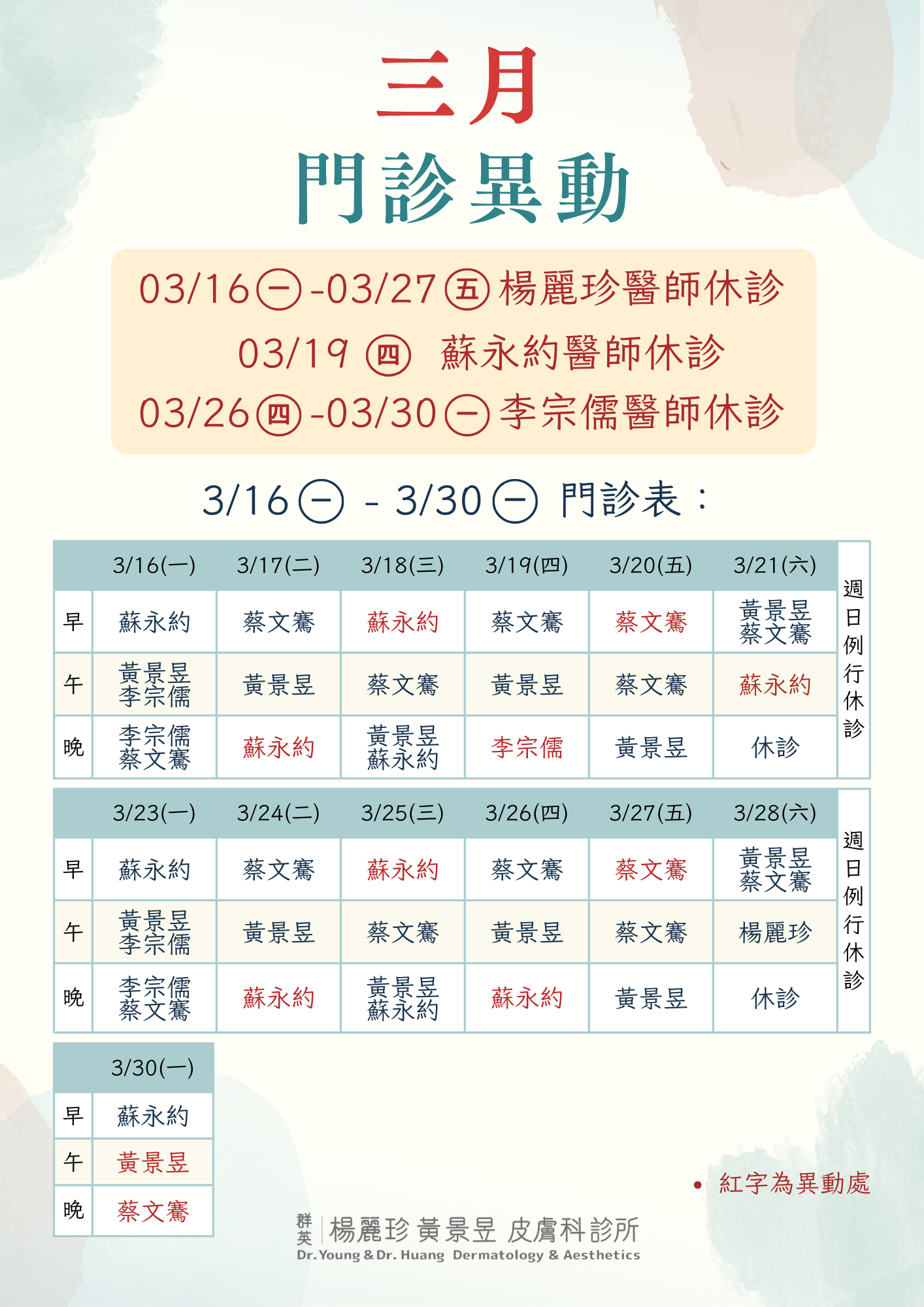 | 晚間 17:30-20:30 | 李宗儒 蔡文騫 | 楊麗珍 蘇永約 | 黃景昱 蘇永約 | 李宗儒 蘇永約 | 黃景昱 | 休診 |